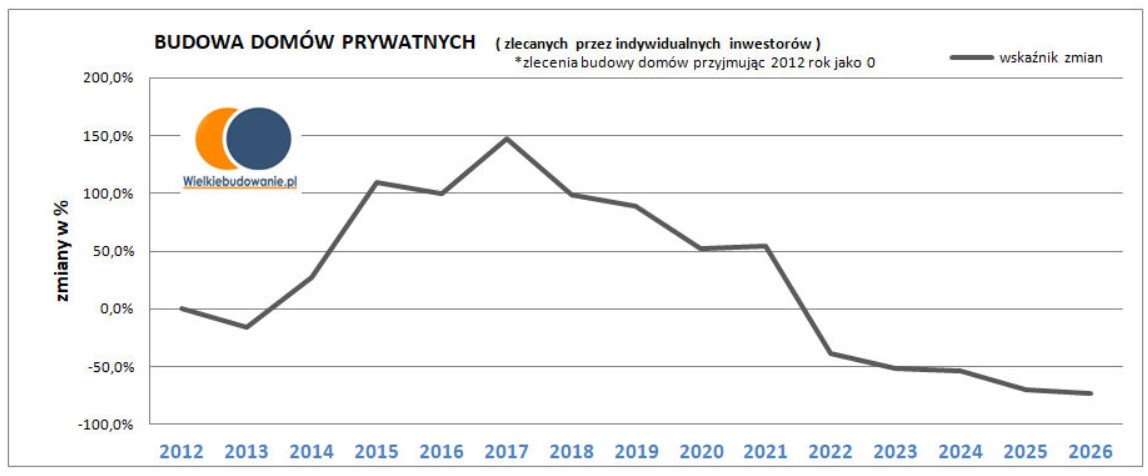 Niezmiennie zła jest sytuacja w segmencie zamówień indywidualnych na budowy domów jednorodzinnych. Ubiegły rok był dla budowy domów prywatnych wyjątkowo słaby, z krótkim początkiem sezonu i szybkim załamaniem popytu od marca, pojedynczymi i nietrwałymi odbiciami w drugiej połowie roku oraz zakończeniem roku z najniższym poziomem zamówień w historii. Tendencja jednolicie spadkowa w tym sektorze utrzymuje się już 9 lat (od 2017 r.) i nie widać impulsów, które mogłyby odmienić ten trend. Według danych rynkowych podawanych przez portal Wielkiebudowanie.pl udział zamówień na budowy domów indywidualnych w styczniu 2026 był niższy o 43% niż rok wcześniej i o 23% niższy niż w grudniu 2025 r.
