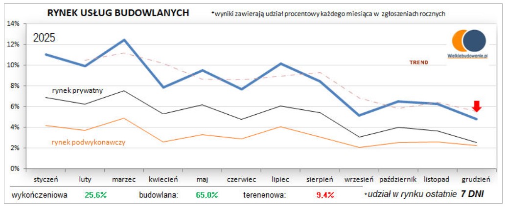 Z uwagi na trend rynkowy w 2025 r. tj. zmniejszającą się podaż inwestycji budowlanych oraz malejące, szczególnie w drugiej połowie roku zapotrzebowanie na usługi budowlane doszło do sytuacji, gdzie z jednej strony wzrosły ceny usług budowlanych, z drugiej zaś spadła i to znacznie rentowność firm budowalnych.
